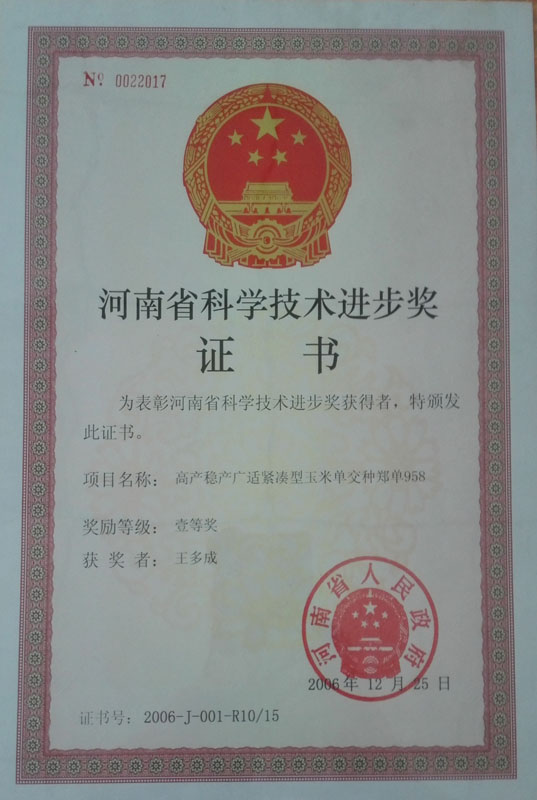 2006年榮獲河南省科學(xué)技術(shù)進步獎